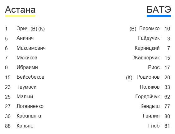 В воротах у казахстанской команды сыграет Эрич, который также является капитаном "Астаны". А в поле с первых минут выйдут Аничич, Максимович, Мужиков, Ибраими, Бейсебеков, Твумаси, Малый, Логвиненко, Кабананга и Каньяс.