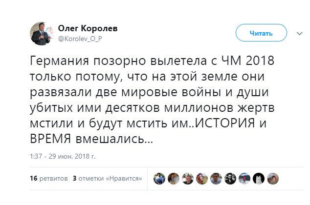 "Германия позорно вылетела с ЧМ-2018 только потому, что на этой земле они развязали две мировые войны, и души убитых ими десятков миллионов жертв мстили и будут мстить им. История и время вмешались", - написал губернатор на своей странице в Twitter