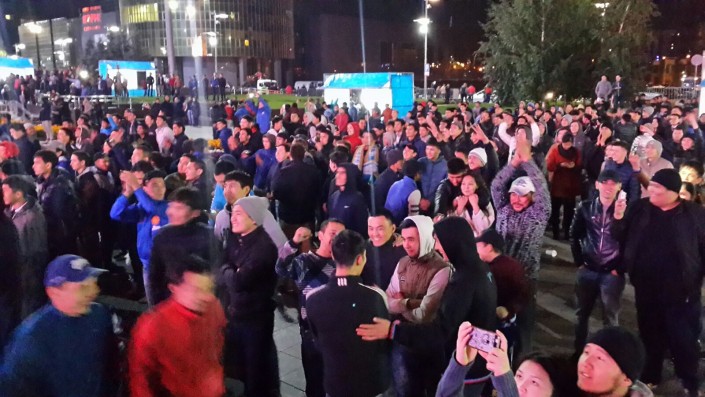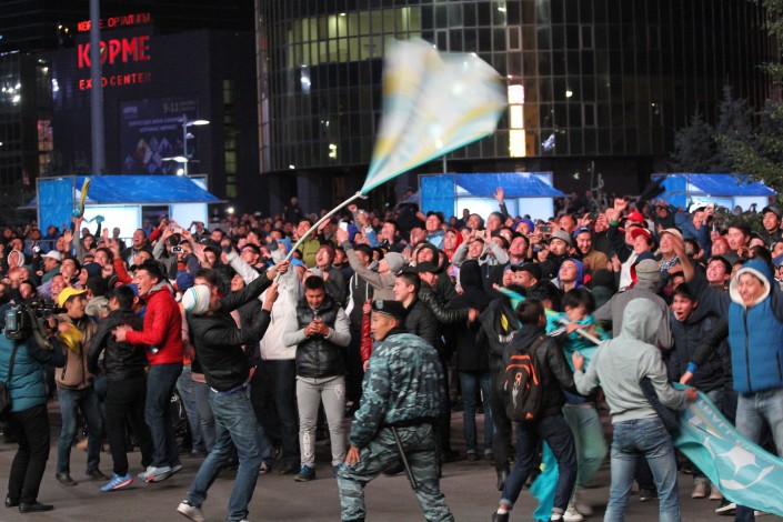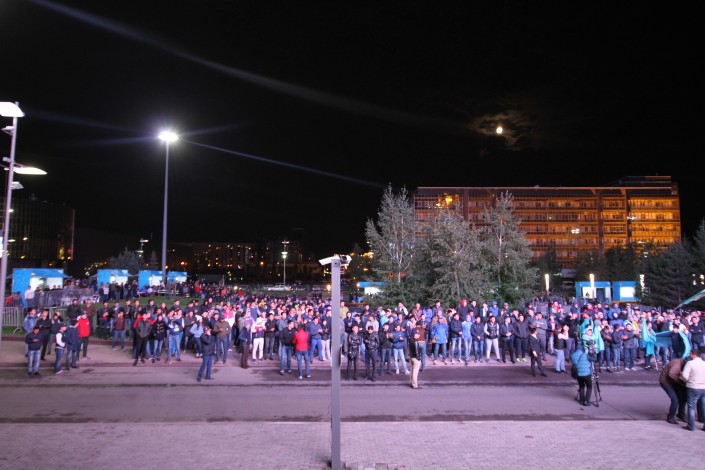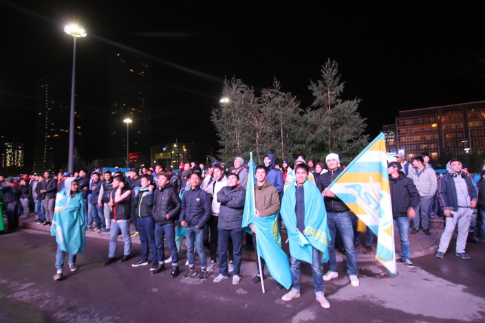 За игрой "Астаны" с кипрским АПОЭЛом столичные фанаты наблюдали на больших экранах "Казмедиацентра". Около трех тысяч болельщиков, несмотря на прохладную погоду и позднее время, собрались, чтобы вместе поддержать своих любимцев. Пришли поддержать команду аким Астаны Адильбек Джаксыбеков, олимпийский чемпион Александр Винокуров и актер Ануар Нурпеисов.