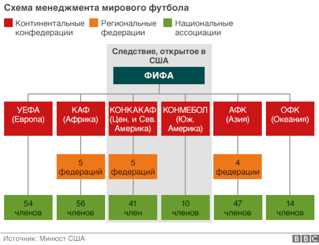 По данным следствия, футбольные чиновники, находясь в преступном сговоре, промышляли рэкетом и отмыванием денег на протяжении 20 лет. По информации западных СМИ, ссылающихся на заявление генпрокурора Швейцарии, минюст страны завел уголовное дело в связи с выбором стран-хозяек чемпионата мира по футболу в 2018 и 2022 годах.