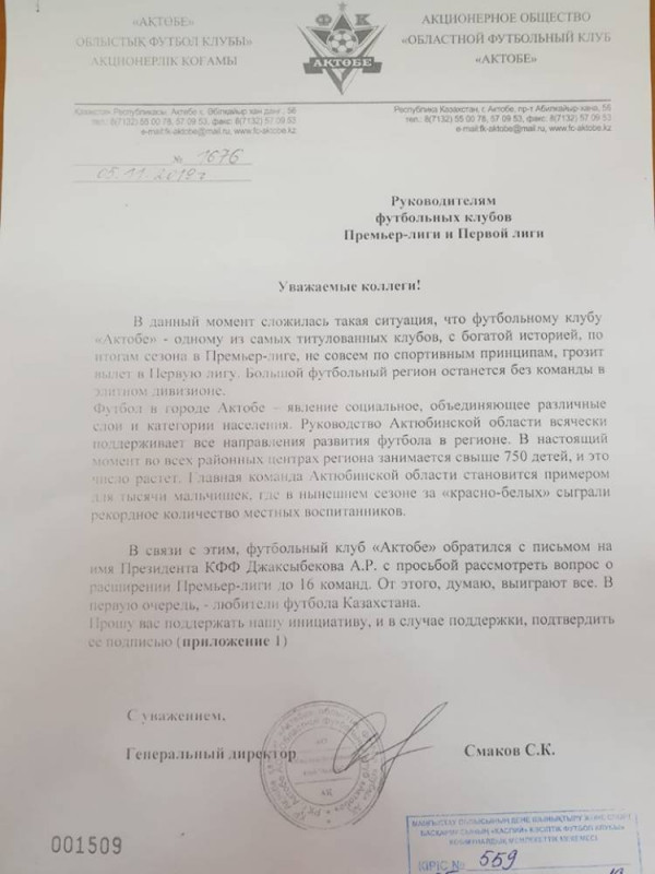 Ранее в Сети появилось письмо, в котором ФК "Актобе" обратился к руководителям клубов КПЛ и к Казахстанской федерации футбола (КФФ) с просьбой о расширении количества участников чемпионата.