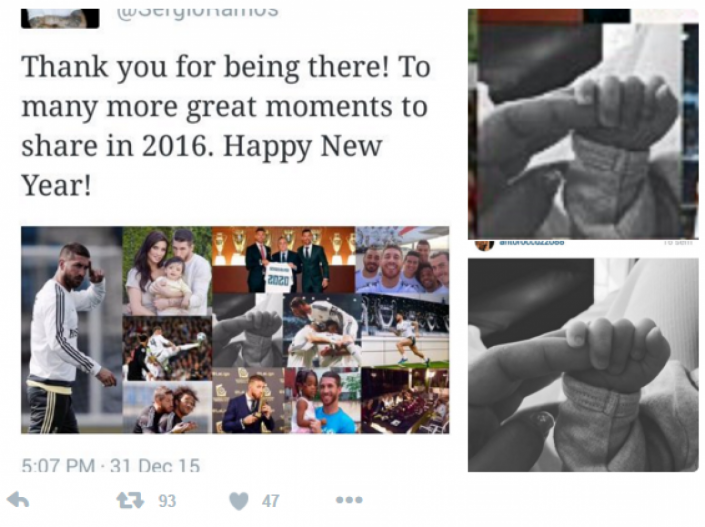 В честь Нового года Рамос опубликовал в своем Twitter коллаж с фотографиями наиболее значимых в его жизни событий в 2015 году, принесшем футболисту второго сына - Марко Рамоса. По нелепой ошибке в коллаж попала фотография из Instagram супруги Лионеля Месси Антонеллы Рокуццо. В минувшем году в семье аргентинца также появился второй сын - Матео.