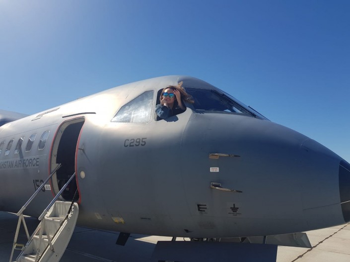 Кстати, журналистам перед вылетом на авиабазу тоже посоветовали: "Фотографируйтесь после прилета". Некоторые коллеги так и сделали. Получился запоминающийся кадр. Небо. Самолет. Девушка...