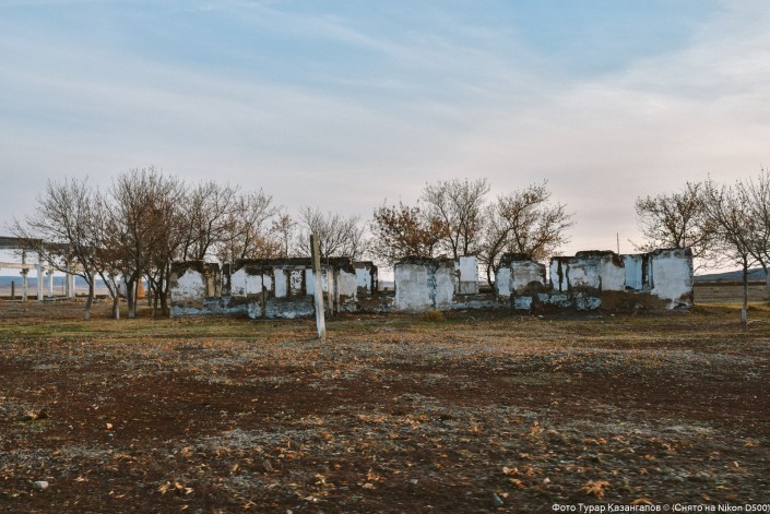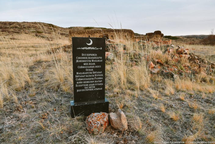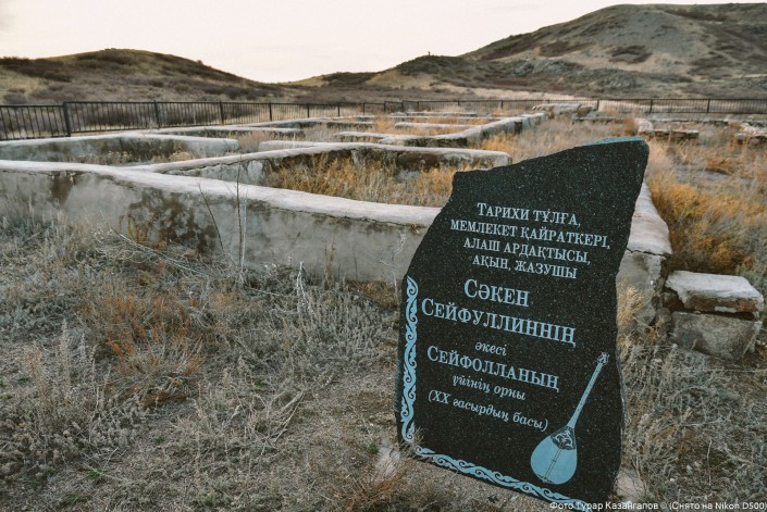 Здесь сохранился фундамент дома отца Сакена Сейфуллина. "Это была зимовка отца Сакена Сейфуллина Сейфоллы, он здесь родился", - говорят жители.