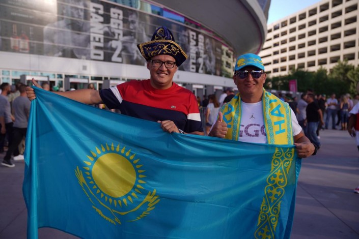Перед началом боя у арены T-Mobile в Лас-Вегасе собирается множество болельщиков. Повсюду можно было увидеть казахстанский флаг.