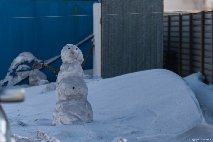 А вот такой сероватый оттенок получил снеговик, стоящий во дворе частного дома, который находится недалеко от ТЭЦ-1.