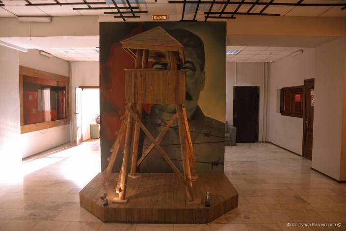 "Обратите внимание на эту экспозицию. Смотровая лагерная вышка, которая своей частью закрывает портрет Сталина. Причем этот портрет написан таким образом, что, с какой бы вы стороны ни встали, он будет смотреть именно на вас", - отмечает сотрудник музея.