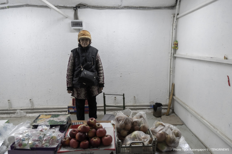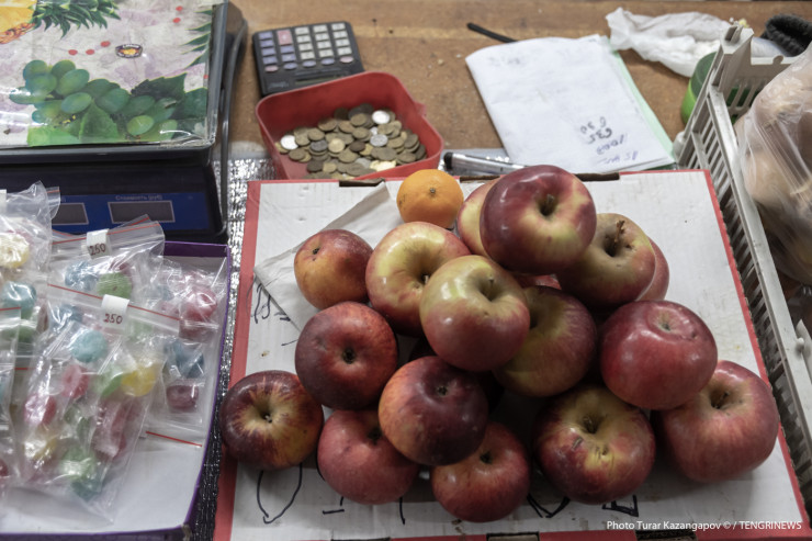 Пенсионерка Кермек Дюйсенова торгует яблоками и конфетами.