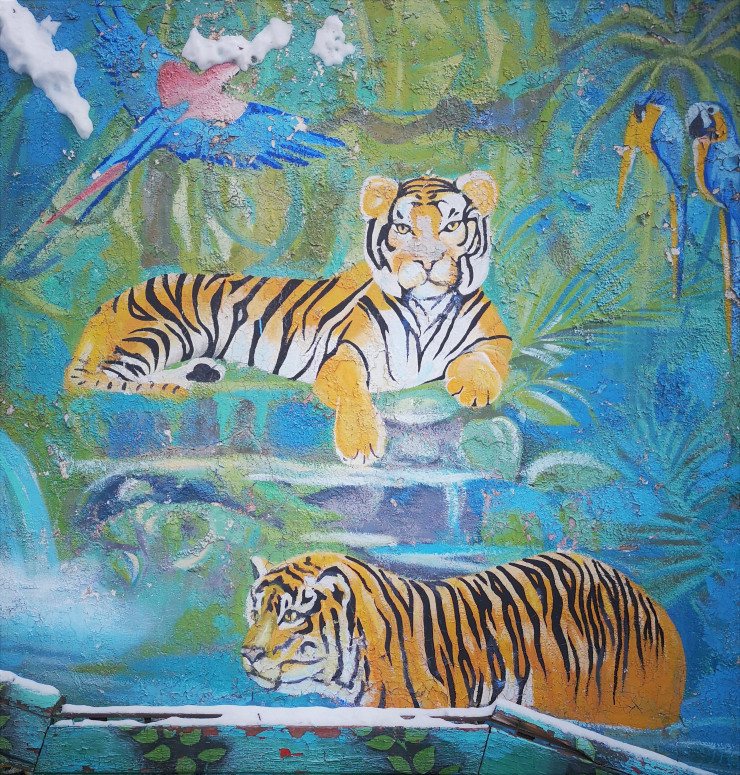 Он расписан изображениями животных. Стая голубей у памятника и собака, всматривающаяся в глаза прохожих, создают ощущение, что эти сказочные картинки с тиграми, львами и другими диковинными зверями будто бы оживают.