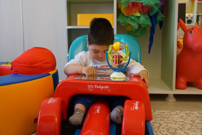 "Это Максат. У него ДЦП. Были прогнозы, что он не сможет ходить, но он недавно у нас пошел. Все благодаря нашей команде реабилитологов и педагогов. Он отказник",  - говорит старший воспитатель Жанна Шинжанова.