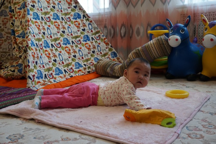 "Это Ахметжан, он у нас временный ребенок. Мама у него есть, но из-за социально-бытовых условий она на время оставила его здесь. Она работает, а после работы приезжает, гуляет с ним. Летом мальчику исполнится годик", - рассказывает старший воспитатель.