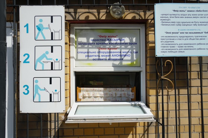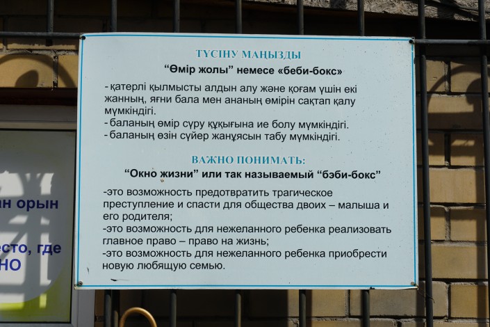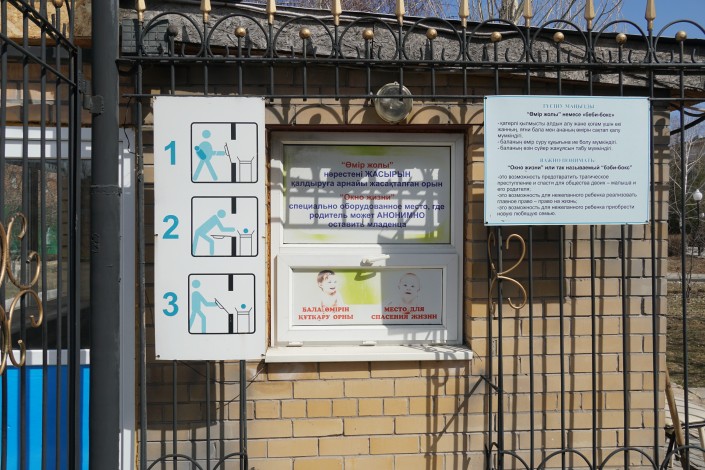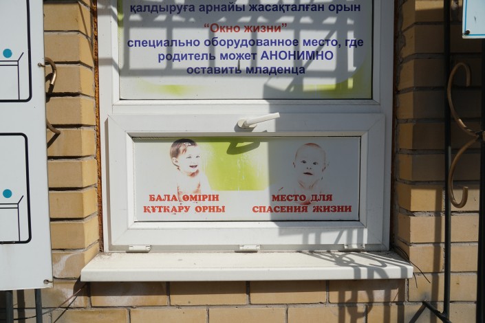 Столица Казахстана. Здание, чем-то напоминающее детский сад. На проходной вертикальная дверца с вывеской "Окно жизни". Это так называемый бэби-бокс.