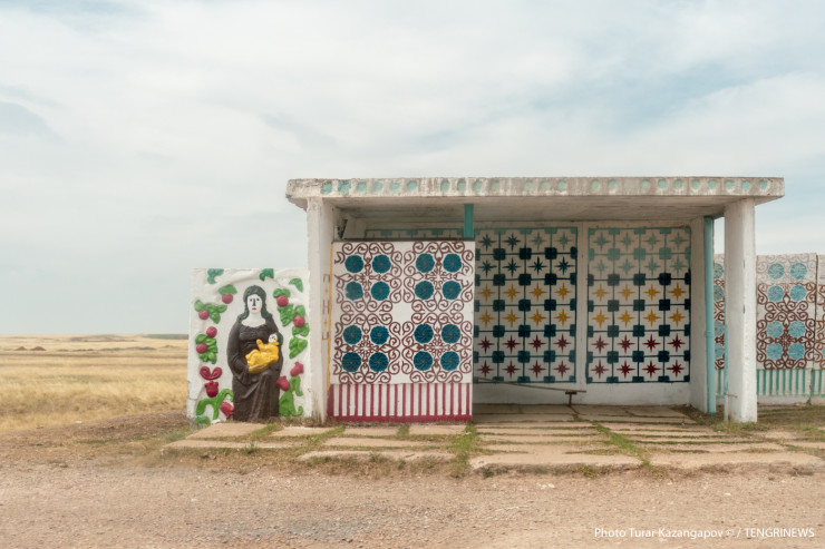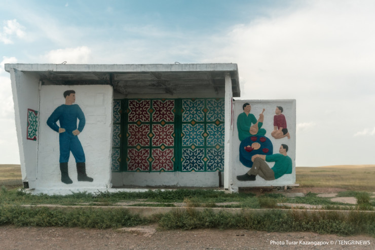 Акмолинская область. По дороге в Державинск нас встречают серп и молот, бескрайние поля с мирно пасущимися животными и колоритные автобусные остановки.
