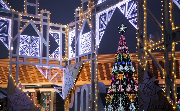 В канун Нового года Алматы засиял праздничными огнями. На улицах города появились красочные елки и необычные световые инсталляции.
