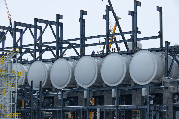 Это будущая установка по производству пропилена. Технологи ее называют установкой дегидрирования пропана. Сырьем является пропан. Он будет поставляться железной дорогой и перерабатываться на установке с получением пропилена. Сейчас ведется монтаж технологического оборудования.