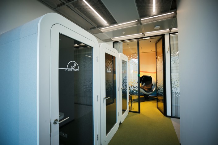 Телефонные будки для приватных разговоров. Специальные шумопоглощающие стенки, а также уникальная система вентилирования помогут сотрудникам провести переговоры с максимальным комфортом.