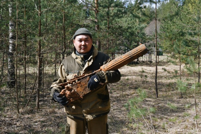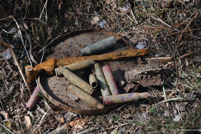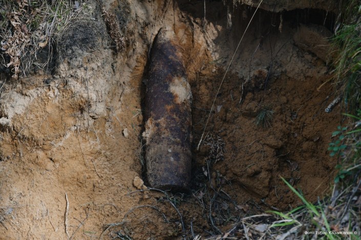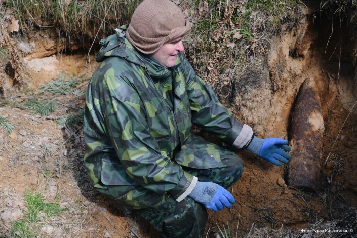 "Этот снаряд в любой момент может взорваться, если его случайно ударить, тряхнуть или просто уронить. Вот он как лежал тут, так и остался. Мы его просто нечаянно раскопали. Теперь мы должны сообщить саперам, они его извлекут и уничтожат. Вот такие у нас обязанности. То есть мы не только ищем бойцов, но и обезвреживаем территорию таким путем", - рассказывает поисковик из столицы Казахстана Виталий Георгиевич Федоров.