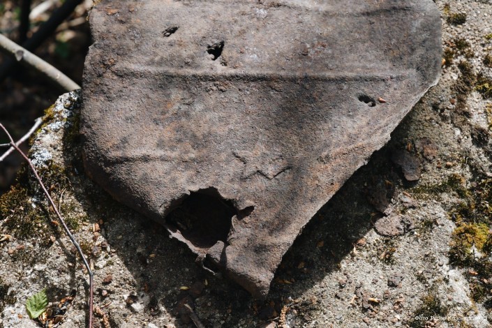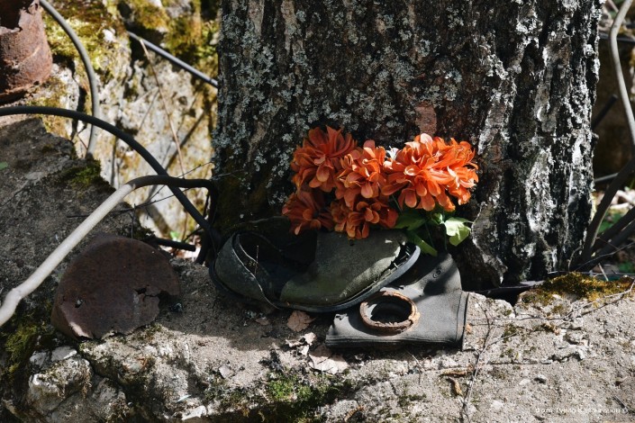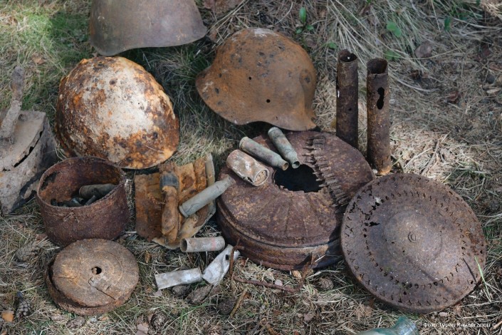 Лежат пробитые каски. Фрагменты солдатских сапог. Противогазы и много других вещей, напоминающих нам о той войне.