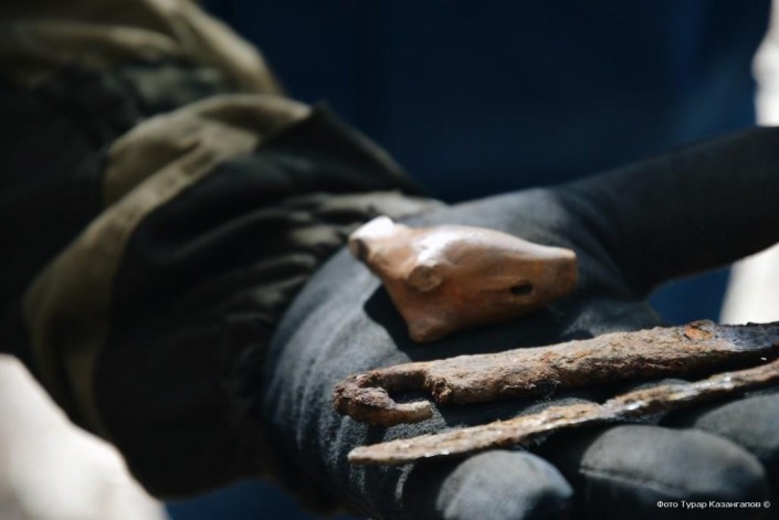 Другие двое наших поисковиков (один из Павлодара, другой из Костаная) демонстрируют еще одну находку: останки солдата с его личными вещами - бритвой, ложкой и игрушкой-свистулькой. "Возможно, он делал эту свистульку для своих детей, чтобы потом домой отправить", - предположил один из них.