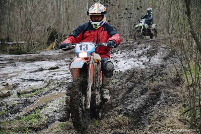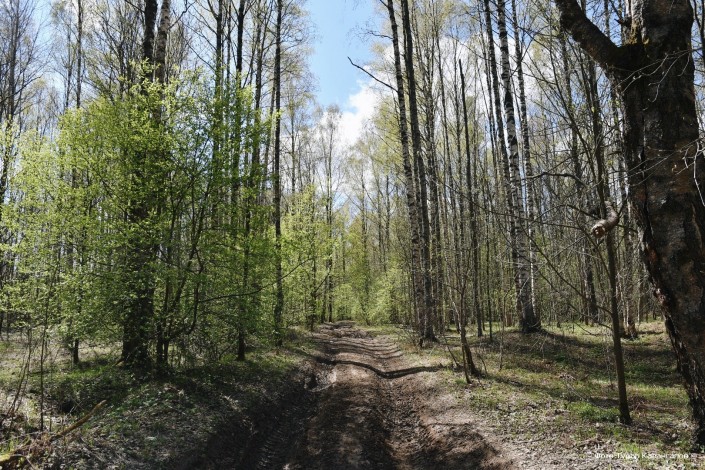 По лесу разносится рев моторов. По грязной дороге меж деревьев проносятся мотоциклисты (местные жители устраивают мото- и автопробег в честь Дня Победы).