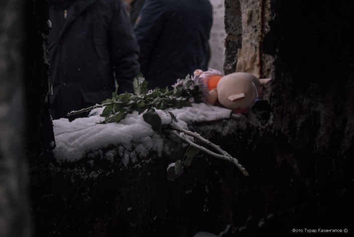 Маленькое обугленное строение. Это и есть сгоревшая времянка, в которой погибли пять девочек. Там, где было окно, сейчас лежат цветы и мягкая игрушка.