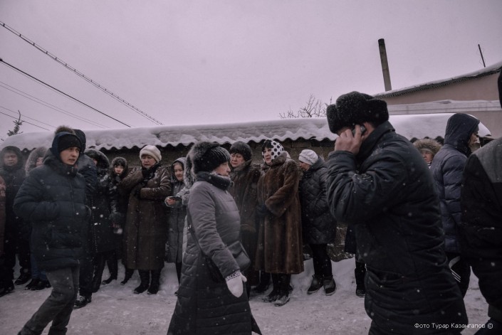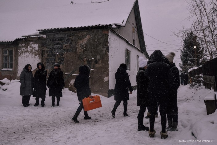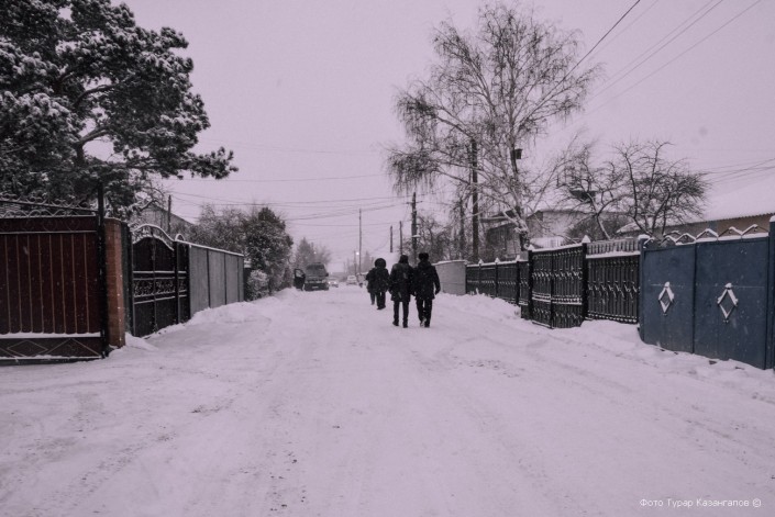 Выходим из авто и идем вдоль частного сектора. Поворачиваем на улицу Шынгыстау. Проходим мимо рябины и останавливаемся возле скопления людей.