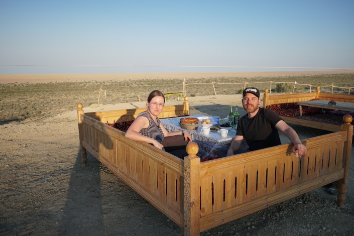 Оказалось, это гостиница, причем очень комфортная и уютная, есть душевые кабинки и тапчан с видом на море. Поверьте, после многих километров по пыльной пустыне эти юрты могут показаться самым лучшим отелем на свете.