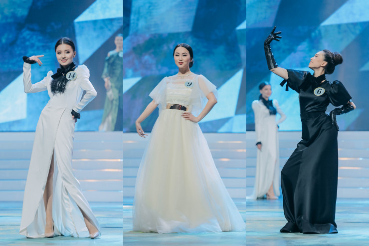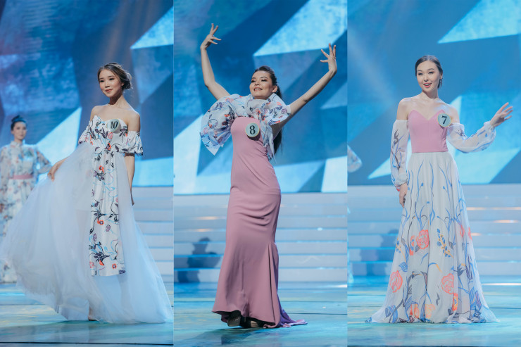 Финалистки дефилировали в нарядах от казахстанских дизайнеров.