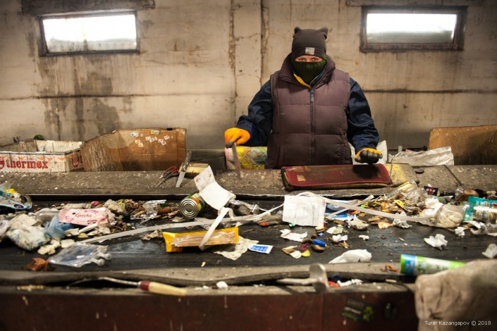 Работница цеха по переработке мусора сортирует бытовые отходы, Темиртау.