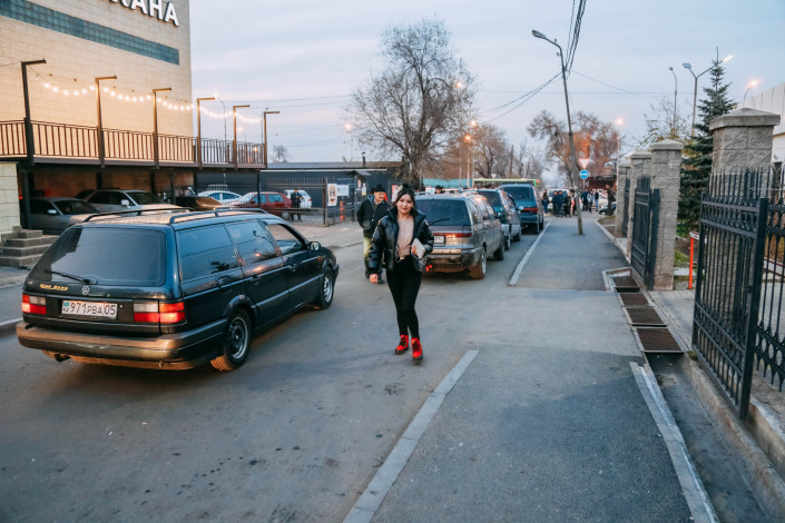 Мы возвращаемся на "Саяхат" к 17:30. Анна должна подойти примерно к 18:15. Мы же решаем понаблюдать, как сегодня живет известный перекресток с "человеческими пробками". Водитель высаживает нас на углу маленькой улицы Есенова и проспекта Райымбека. Мы удивились, что люди голосуют уже здесь. Уехать можно в Иссык, Талгар и все поселки вдоль трасс – Бесагаш, Туздыбастау, Кызыл Кайрат... Однако большинство машин подбирают пассажиров дальше - на пересечении Райымбека с односторонней Джангильдина.