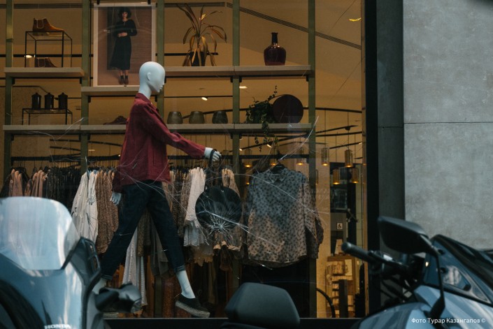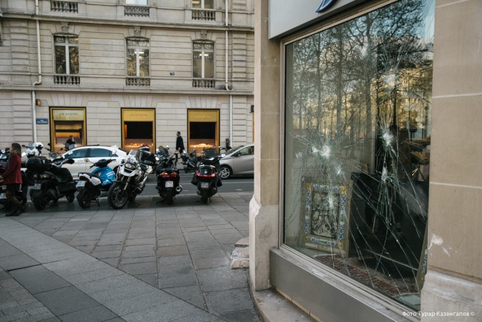 Следы от предыдущих погромов заметны на витринах бутиков.