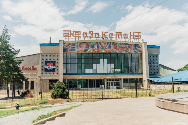 Вот еще одно легендарное здание - кинотеатр "Казахстан". Сейчас он пустует, но одну женщину мы там встретили. Она предположила, что зданию не меньше 40 лет, правда, как кинотеатр оно уже давно не существует, скоро здесь открывается кафе.