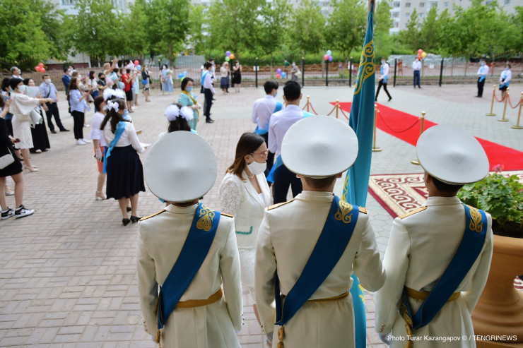 Утро во дворе одной из школ в Нур-Султане. Красная ковровая дорожка. Выпускники с синими лентами, суетящиеся учителя и родители с охапками цветов.