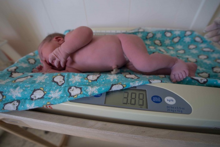Взвешивают. Вес этой новорожденной девочки – 3 килограмма 890 грамм