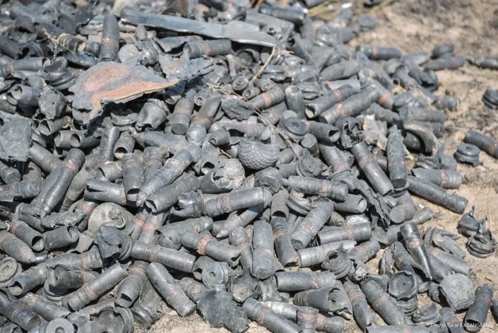 Все фрагменты разорвавшихся снарядов складируют в одном месте.
