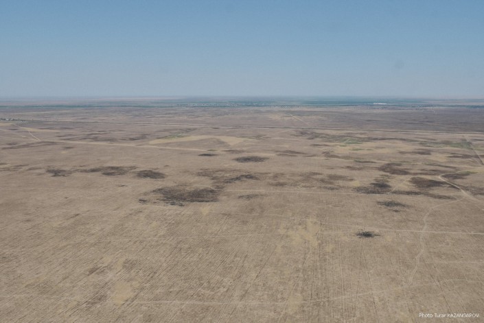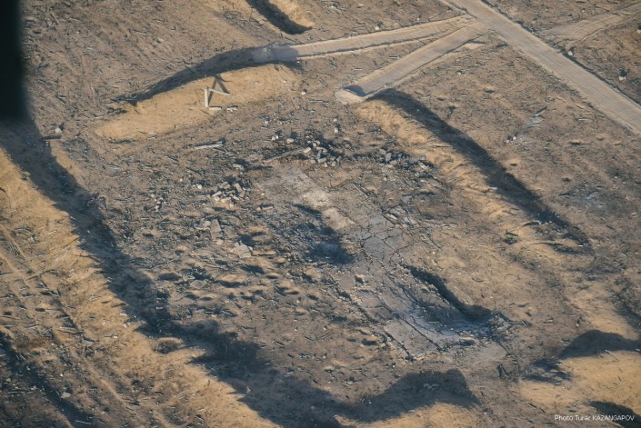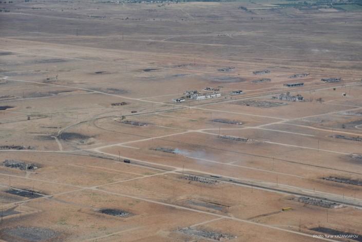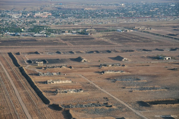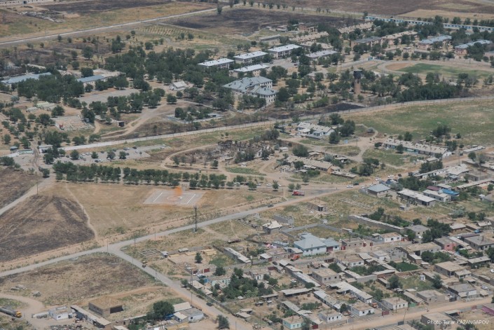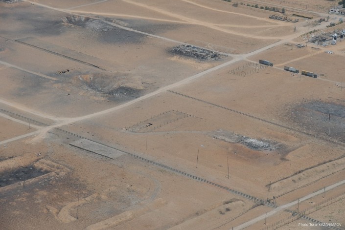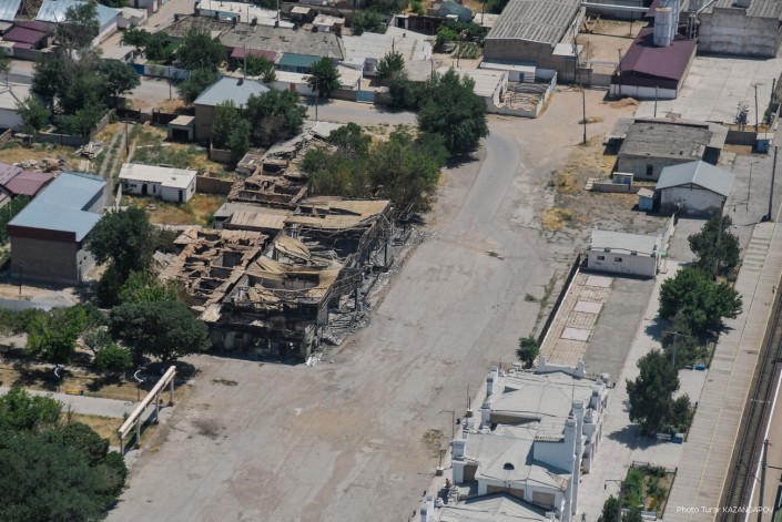 Так сейчас выглядит город Арысь, где 24 июня взорвались склады с боеприпасами. Борт министерства обороны совершил плановый облет окрестностей Арыси. Фотокорреспонденту Tengrinews.kz  Турару Казангапову удалось сделать несколько эксклюзивных кадров с высоты.