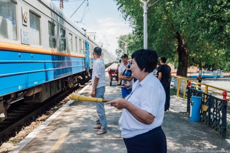 Она же и провожает состав. "Если есть какая-то проблема в поезде, - говорит Нуржайна, - то проводники при отправлении красный флажок поднимут, а если все нормально, то желтый будут держать".