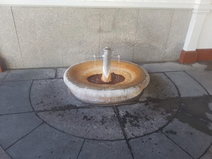 А это горячий источник, который вывели наружу. Его место было немного в другом месте, однако из-за ремонта колоннады его перенесли. Высота горячего фонтана была в несколько раз выше.