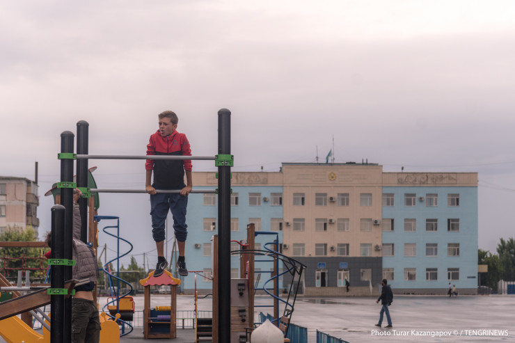 Вон я была в Астане, там понаделали турники всякие, площадки возле каждого дома, даже старики занимаются, и дети бы тоже у нас занимались чем-то", - говорит Татьяна, и прямо за ней свои мастерство и ловкость показывают атбасарские пацаны.