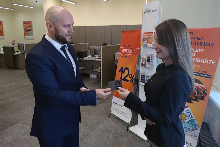 Вручив вертикальную карту № 1 новому клиенту, Руслан Волынец отметил, что теперь Татьяна может бесплатно снимать до 300 тысяч тенге в месяц в любом банкомате по всему миру.