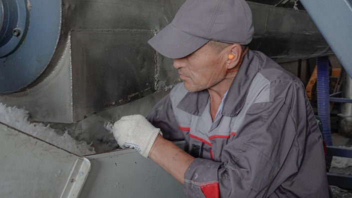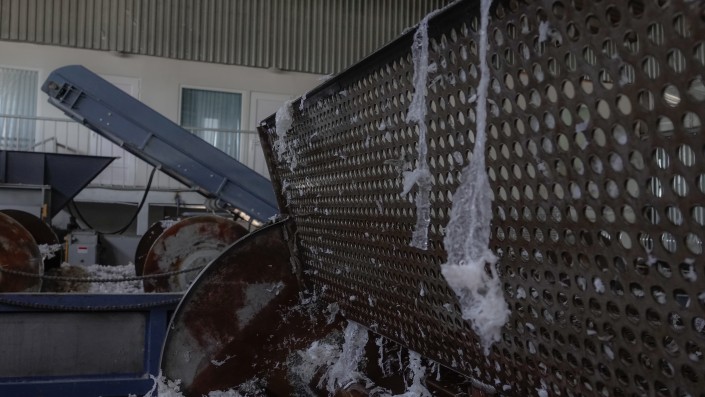 "Берется тюк, ставится возле сортировочного аппарата. Там он раскрывается, кидается на ленту, где сырье перемалывается и рубится. Потом то, что получилось, падает во фрикцион, это тоже своего рода дополнительная степень очистки, которая с помощью воды и движения шнеков дает отбивку грязи. Затем масса падает в бассейн и тщательно промывается в нем, опять попадает во фрикцион, еще раз отбивается и попадает во второй бассейн", - описывает Валерий свое производство.