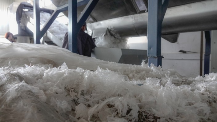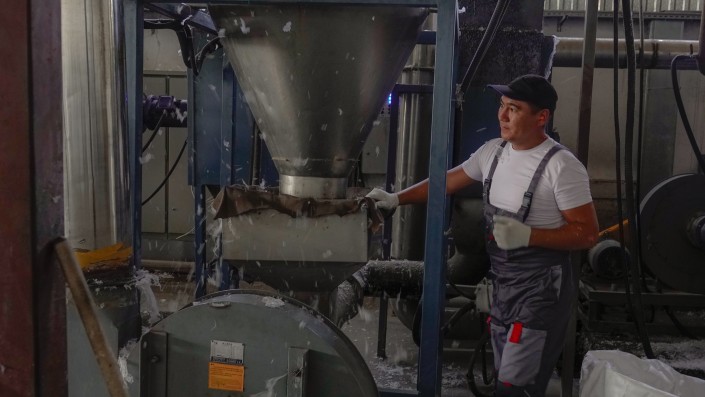Сырье, которое Qazaq Recycling получает со всего Казахстана, стоит от 150 тенге за килограмм. Первичный пластик дорогой, соответственно, вторичный дешевле, но тоже стоит денег: в его стоимость входит сбор и первичная сортировка. Во многих городах Казахстана есть представители, которые собирают макулатуру, пластиковые ПЭТ-бутылки и полиэтилен, сортируют их. Компания заключает с этими компаниями контракт и получает от них сырье. Предварительно на этапе сбора пластик чистят, главное, чтобы в этих тюках не было, например, кирпичей, стекла, веревок, ПЭТ-бутылок.