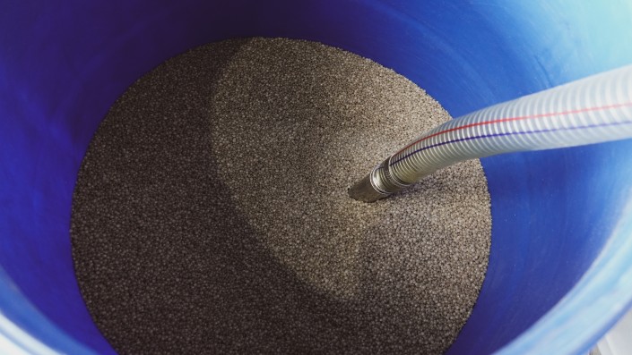 Следующий этап – центрифуга, которая за счет быстрого вращения отбивает с пластика воду и последние частицы песка. Получившиеся чистые хлопья сушатся и по конвейеру отправляются в компактор. В нем сырье разогревается до 70 градусов, превращается в единую массу, которая автоматически подается в шнек. При выходе из шнека специальные ножи режут пластик на гранулы.