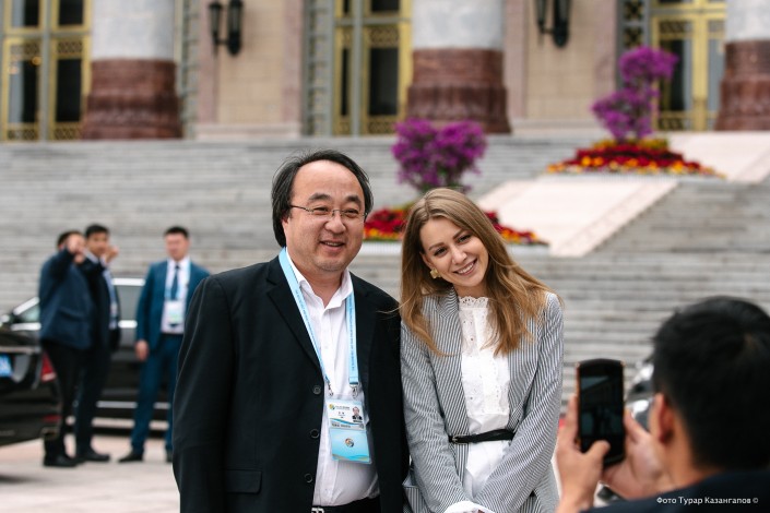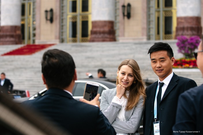 После награждения лидеры стран отправились на обед. Пока представители СМИ ждали их выхода на улице, один из водителей китайского кортежа набрался смелости и подошел к журналистке Алене из Казахстана с просьбой сфотографироваться.