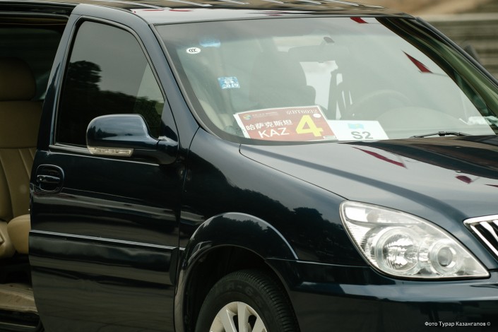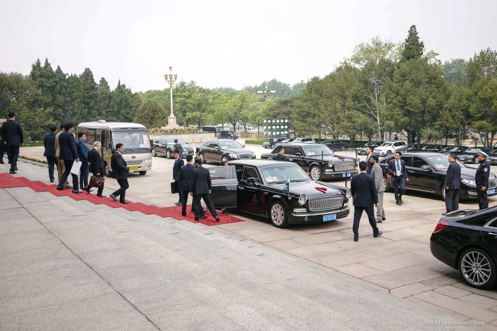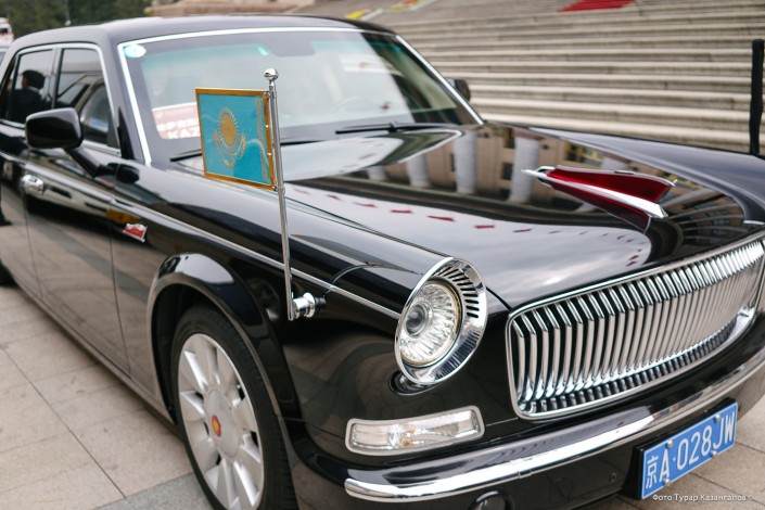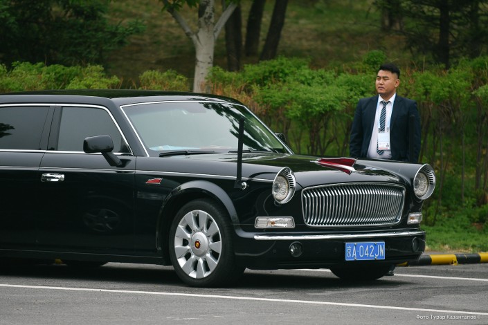 Вот представительский автомобиль для казахстанской делегации. Это лимузин FAW Hong Qi HQE "Красное знамя". Длина - 6,4 метра. Он стилизован под первые Hong Qi 50-х годов прошлого столетия.