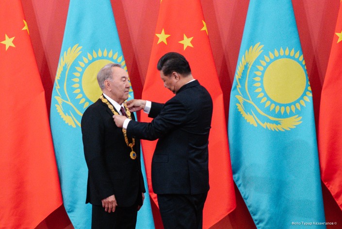 "Мы проводим торжественную церемонию, чтобы вручить давнему и большому другу китайского народа - Первому Президенту Казахстана господину Назарбаеву высшую награду Китайской Народной Республики - Орден Дружбы", - объявляет председатель Поднебесной.