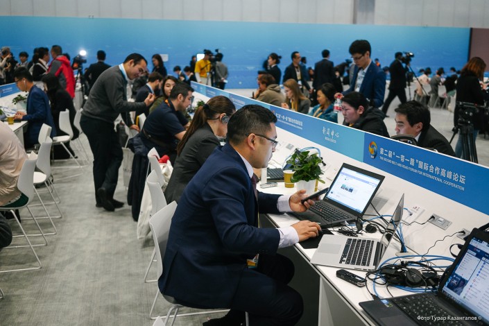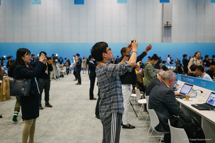 Для СМИ выделили отдельное здание - многоуровневый медиацентр, где с утра до глубокой ночи работали экраны, динамики. Казахстанский журналистский пул на официальных мероприятиях занял без малого два длинных ряда рабочих столов.