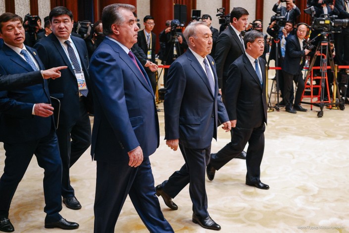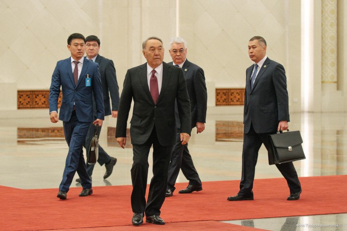 Нурсултан Назарбаев вошел в зал вместе с президентом Таджикистана Эмомали Рахмоном. Оба были серьезны.