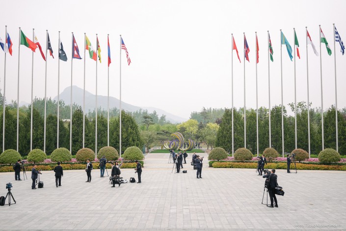 Встреча лидеров во второй день форума прошла в удаленном от центра Пекина в международном культурном центре "Яньци". На фоне гор почти астанинский ветер раздувал флаги. Наш - пятый в правом крыле.