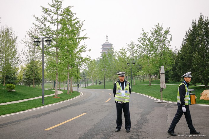 Во время форума дороги в Пекине перекрывали основательно. Часть парка возле медиацентра оцепили, поэтому в перерывах между сессиями журналисты могли насладиться прогулками по опустевшим, явно рассчитанным на очень большое количество людей аллеям.